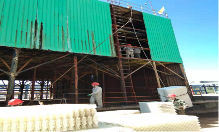 冷卻塔填料更換已然不是之前直接性的你接我送,而是利用滑輪與繩索進行起吊,不僅大大的提高了工作效率,一眼望去也簡單了許多,這是大家齊心協力,在實踐中摸索出來的智慧與力量。