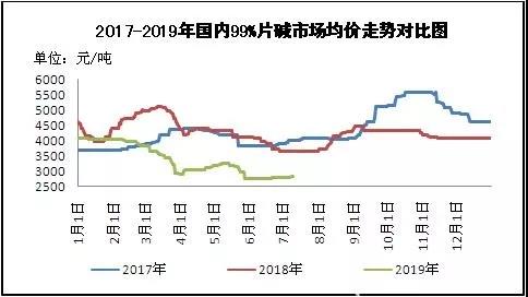 圖1 2017-2019年國內99%片堿市場均價走勢對比圖