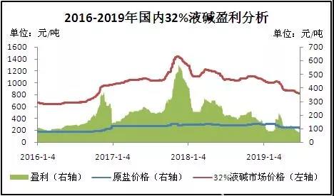 從圖3和圖4可以看出,今年以來國內燒堿供強需弱,市場價格承壓下跌,導致利潤空間明顯收窄。以西北地區具有自備電廠的氯堿企業為例,1-6月,32%液堿日均利潤在118元/噸,較2018年同期(平均275元)下降157元/噸,跌幅為57%。99%片堿日均利潤在972元/噸,較2018年同期(平均1767元)下降795元/噸,跌幅為45%。據悉山東片堿加工廠由于使用天然氣作為燃料,生產成本高位,但市場價格早跌破生產成本線,導致當地廠家長時間停產。