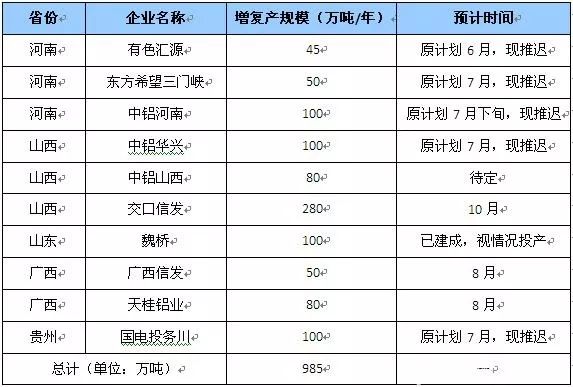 表1 2019年國內氧化鋁增復產統計(數據來源:東證期貨)