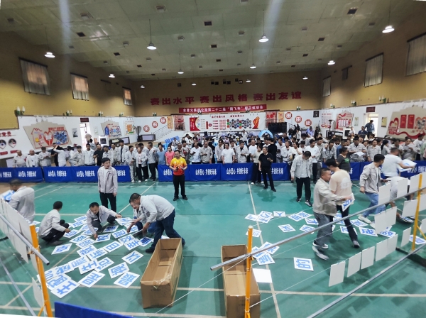隨著裁判一聲令下,企業理念拼字比賽迎來激動人心的時刻。各參賽隊員不急不躁、有條不紊,大家集思廣益、默契配合,在最短時間內準確拼出“踐行綠色發展 留駐青山綠水”“山水昱心 共創好未來”“安全就是幸福 安全就是效益”等橫幅。