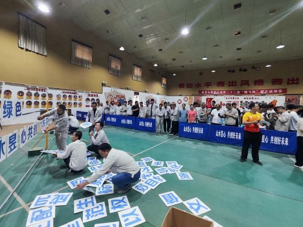 隨著裁判一聲令下,企業理念拼字比賽迎來激動人心的時刻。各參賽隊員不急不躁、有條不紊,大家集思廣益、默契配合,在最短時間內準確拼出“踐行綠色發展 留駐青山綠水”“山水昱心 共創好未來”“安全就是幸福 安全就是效益”等橫幅。